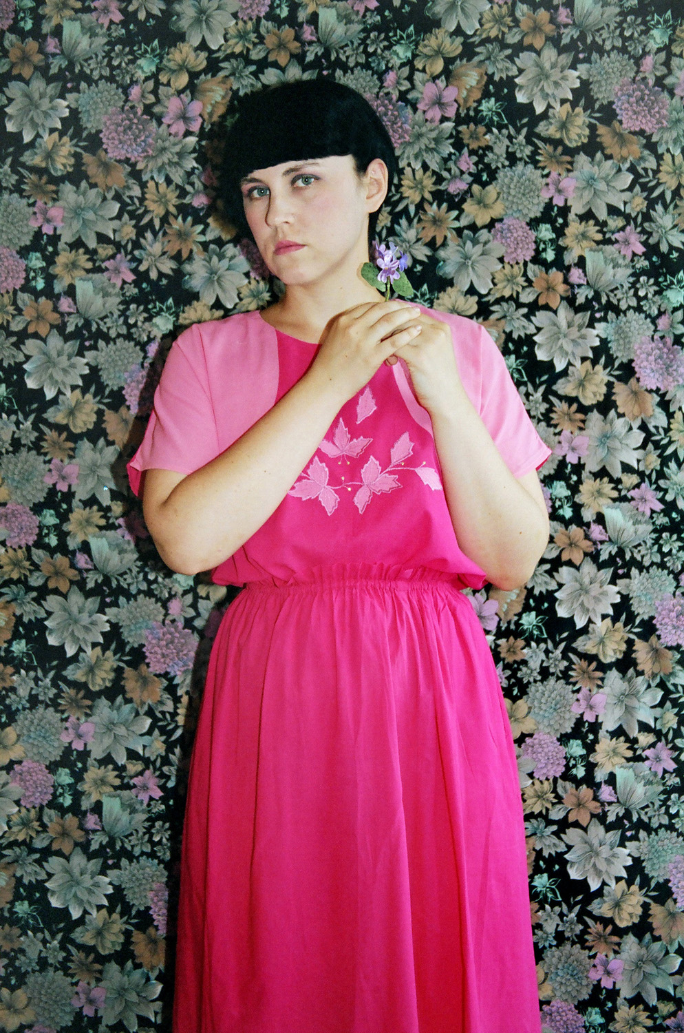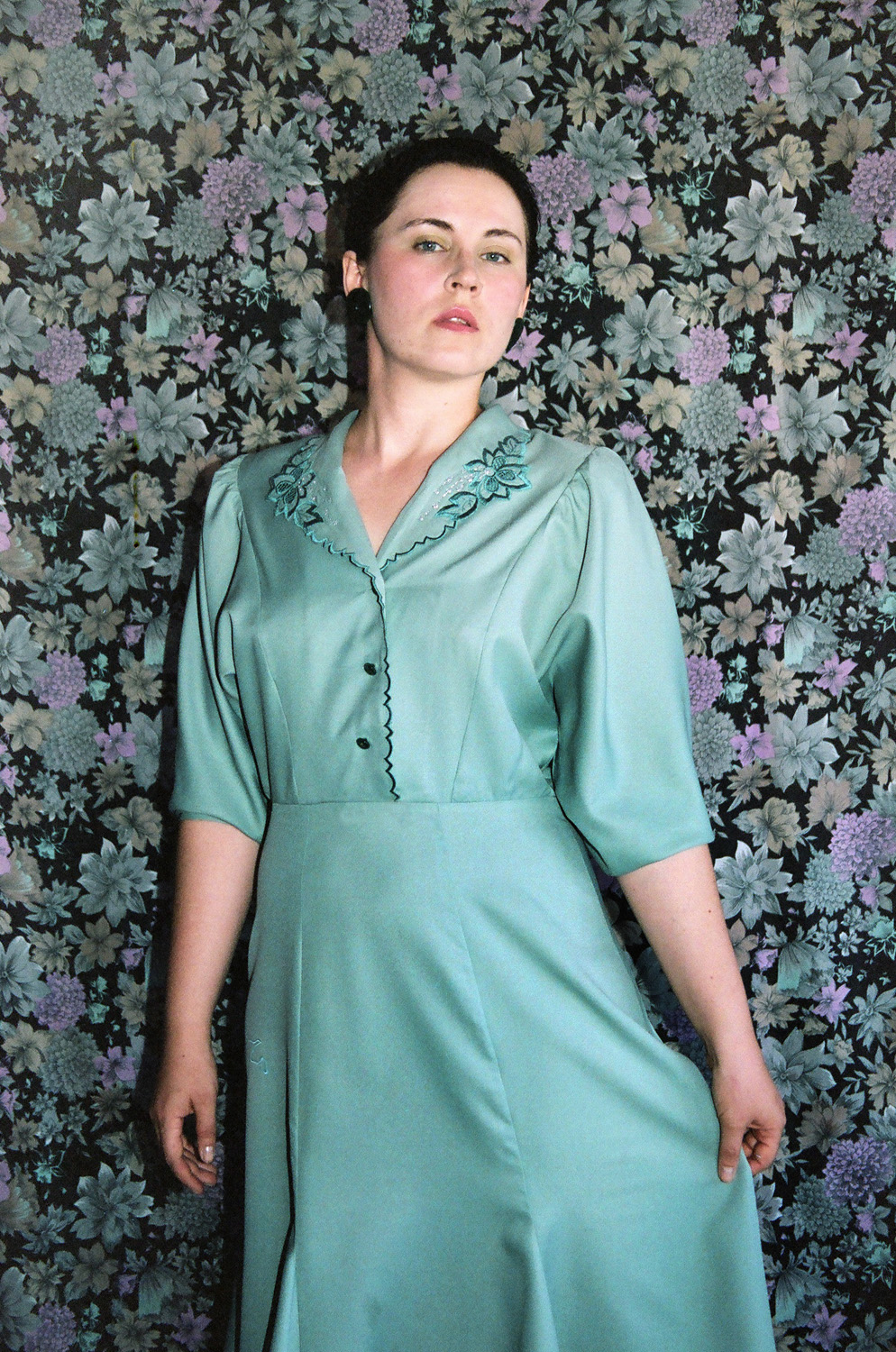 Ярко-зеленое крепдешиновое платье с рисунком в виде красных цветов, 1983 год. «Этим платьем мама осталась недовольна. Она отправилась в ателье и попала к другой закройщице, которая раскроила платье не так, как нужно было. Поэтому мама носила его редко, но я его люблю и ношу до сих пор».