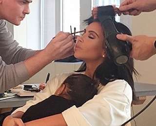 Сегодня знаменитость опубликовала в сети снимок, на котором она изображена с малышкой Норт на руках, при этом над ней "колдуют" визажист и парикмахер.