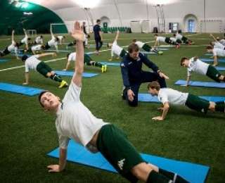 У воспитанников проходят две-три тренировки в день — и это помимо обучения. Кроме ОФП и специальных футбольных тренировок детей учат азам акробатики на батуте, который располагается в одном из тренажерных залов главного корпуса академии.