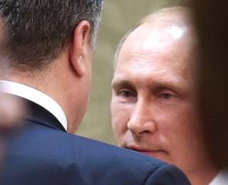 Белоруссия. Минск. 11 февраля. Президент Украины Петр Порошенко и президент России Владимир Путин (слева направо) во время встречи в "нормандском формате" по урегулированию кризиса на юго-востоке Украины.