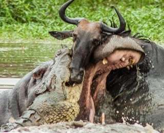 Антилопа Гну спокойно пила воду в реке, на её беду это увидел крокодил и решил перекусить антилопой. Но беда не приходит одна, возмущенный непонятной ситуацией на своей территории бегемот, подключился к истязаниям, и больше всего досталось антилопе. Эти кадры снял фотограф-любитель Nick Fleer (27) в Южной Африке.