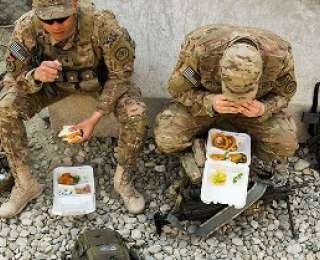 В качестве главного блюда воины Ее Величества получают куриную сардельку с бобами, пасту с тунцом и, как ни странно, паэлью. Приятное дополнение — соус табаско. Чай, кофе, компот или фруктовый напиток можно выпить с лимонным кексом, малиновым джемом, карамельным батончиком мюсли, солеными орешками кешью, конфетой или шоколадной пастой. Предусмотрены также таблетки для обеззараживания воды, бумажные полотенца и влажные салфетки.