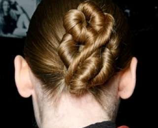 На показе Naeem Khan стилисты по волосам такими простыми приемами не отделались. Вместо того чтобы просто собрать волосы сзади, они сначала хорошенько распрямили их, получив идеально гладкое полотно, которое к тому же еще и зеркально блестело, разделили их на модный боковой пробор и лишь потом стали закручивать их в достаточно тонкие жгуты, которые потом переплели между собой. Изящный вариант «запутанного клубка» от Naeem Khan подходит даже для вечерних случаев.