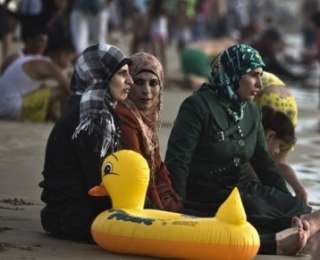 Обычно люди на пляже максимально оголяются, а на некоторых и вовсе можно увидеть одни солнечные очки, но у палестинских женщин всё наоборот. На пляже они отдыхают в полном облачении с платками на головах. Эти фотографии сделаны на берегу Средиземного моря 11 августа 2013г., на пляже Тель-Авива во время праздника Ид аль-Фитр, который знаменует окончание месяца Рамадан.