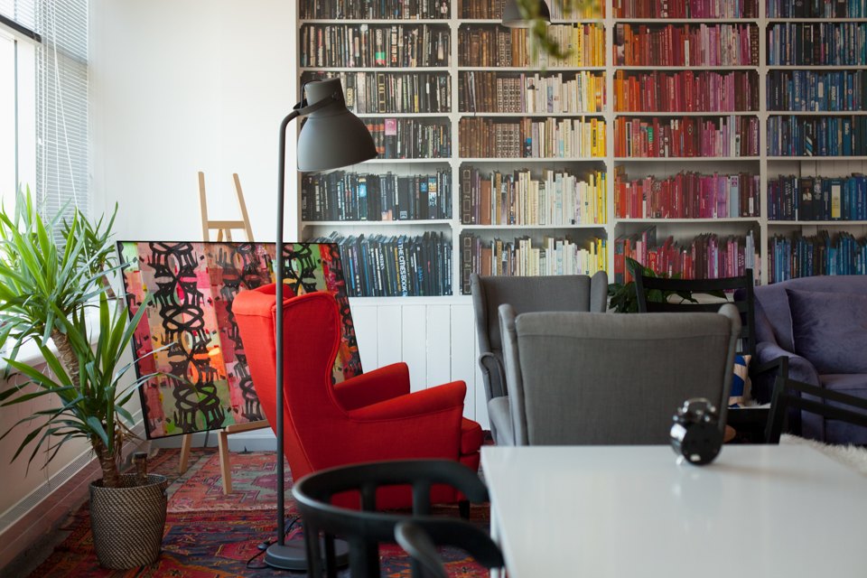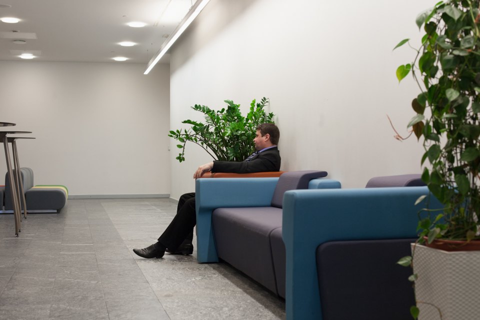 17. Офис спланирован в формате оупенспейса. Помимо стандартных рабочих мест, есть рекреационные зоны, где также можно посидеть с ноутбуком. Для того чтобы сотрудники могли найти друг друга, разработана система навигации и цветового зонирования: например, можно назначить встречу на пятом этаже в красной зоне. В некоторые столы вмонтированы беспроводные зарядки для телефонов. Помимо стандартных переговорных для встреч, есть места для индивидуальной работы или разговоров по телефону.