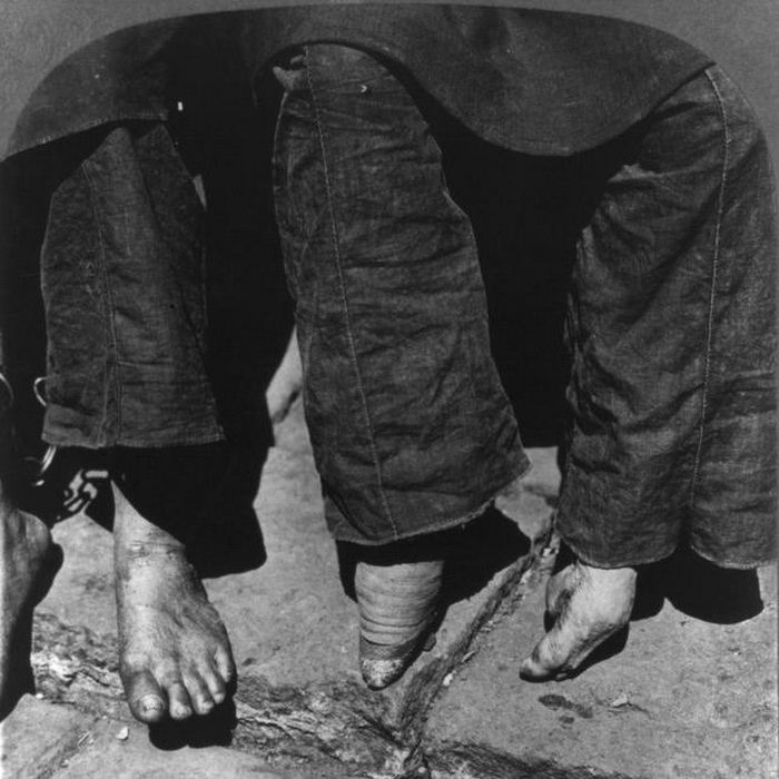Несмотря на утонченное название, походили они скорее на копытца: с четырехлетнего возраста конечности девочки постоянно бинтовались, 4 пальца «прирастали» к стопе, длина которой составляла 7-10 см. Ноги часто кровоточили, гнили, источали зловонный запах, кости ломались, ногти врастали в кожу. Пыткам подвергались девочки в наиболее богатых семьях, это было признаком аристократизма и залогом успешного замужества. К слову, муж никогда не видел «лотосовых» ног жены, даже в постели она оставалась в изящных туфельках.
