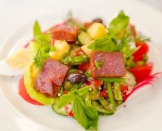 Маринуем тунец в смеси паприки, кумина и соли. Обжариваем с каждой стороны на сухой тефлоновой сковороде без масла, так, чтобы внутри он был полностью сырой. Порезать ломтиками. Отварной картофель нарезать кубиками. Кенийскую фасоль отварить в соленой воде, затем быстро остудить в ледяной воде и порезать. Болгарский перец запечь, охладить, удалить кожицу, порезать кубиками. Листья салата промыть, просушить и крупно порвать. Яйцо отварить и порезать дольками на 4 части. Помидоры и редис порезать ломтиками. Смешиваем вместе помидоры, редис, листья салата, болгарский перец, картофель, оливки. Заправляем оливковым маслом и бальзамическим уксусом, добавляем соль и перец. Выкладываем на тарелки, сверху добавляем ломтики тунца и яйцо. Посыпаем антипасти мелко нарезанной зеленью и поливаем соусом песто.