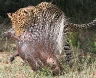 Леопард отдыхал на дереве возле дороги в национальном парке Крюгера в Южной Африке, когда появился дикобраз. Леопард захотел полакомиться свежей дикобразинкой, но после ряда попыток атаковать, он лишь получил несколько иголок в нос и лапы, и убрался ни с чем. Эти кадры снял Yusuf Chavoos, когда ехал по дороге через парк.