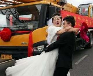 Один не настолько богатый паренек смог организовать кортеж из не менее дорогого транспорта. Свою избранную он прокатил на автокране, которых всего было арендовано четыре штуки.