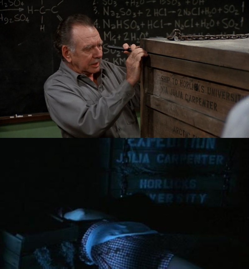 В сегменте кинокомикса «Калейдоскоп ужасов Стивена Кинга» под названием «Ящик» фигурирует некое неизвестное науке смертоносное существо, найденное под лестницей американского университета. Существо было запаковано в ящик с надписью «Арктическая экспедиция Джулии Карпентер из Хорликского университета. 19 июня, 1834» — в этом контейнере оно, согласно сюжету, просидело последние полторы сотни лет. Пролив немало крови, в итоге тварь вместе с ящиком была отправлена на дно озера. Однако ее приключения на этом не закончились: несколькими годами позже ящик был замечен в подвале семьи Вурхизов в хорроре «Джейсон отправляется в ад» (кстати, там же чудесным образом засветились костяной нож и книга «Некрономикон» из «Зловещих мертвецов — 2»). И фамилия «Карпентер» на ящике, разумеется, фигурирует не случайно — это прямая отсылка к режиссеру Джону Карпентеру, снимавшему свой хоррор об Арктике «Нечто» в одно время с «Калейдоскопом ужасов».