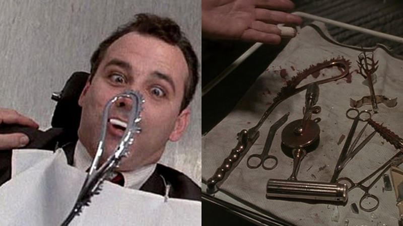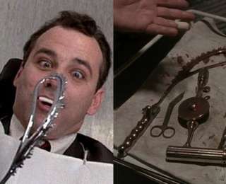 В фильме Тима Бертона «Бэтмен» пластический хирург, «исправляющий» улыбку Джокера, оперирует презанятным набором инструментов, среди которых выделяется некая петлеобразная штука с шипами, как будто специально созданная для пыток. Стоп! А не тот ли это самый стоматологический инструмент, что принадлежал Стиву Мартину в «Маленьком магазинчике ужасов» и был применен им к Биллу Мюррею? Вы правы — тот самый. Но этим широкий спектр его применения не ограничивается — например, в триллере Дэвида Кроненберга «Связанные насмерть» тот же пыточный набор был замечен уже в… кабинете гинеколога. Окулисты и проктологи им пока не интересовались, но что-то подсказывает нам, что это лишь вопрос времени.