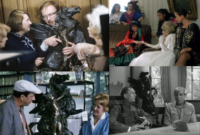 Не Голливудом единым: советский кинематограф тоже с удовольствием использовал одни и те же вещи в разных фильмах. Первое место среди любимых предметов «Мосфильма» держит статуя «Персей и Пегас» работы французского скульптора Эмиля-Луи Пико, наиболее памятная зрителю по двум комедийным кинохитам — «Служебный роман» (именно эту подарочную лошадь Новосельцев вез в лифте, называя ее «мамонтом») и «Бриллиантовая рука» (Семен Семеныч Горбунков, как мы помним, пытался приобрести в комиссионном магазине «такого же, но без крыльев»). В первый раз на экране скульптура, однако, предположительно появилась еще в 1950 году в ленте Михаила Ромма «Секретная миссия». Затем был «Пакет» Владимира Назарова, а после «Бриллиантовой руки» и «Служебного романа» Персей с Пегасом были замечены в кабинете редактора в ленте «Мой ласковый и нежный зверь».