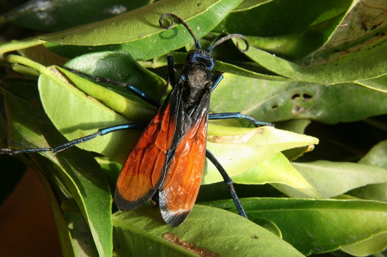 Судя по тому, что эта оса предпочитает охотиться на тарантулов, вы вряд ли были бы рады встрече с ней. Ее можно легко узнать по голубовато-черному туловищу и ярко окрашенным крыльям. Она обладает длинными конечностями с крюкоподобными когтями на концах, которые помогают им удерживать жертву. Шмидт сравнивал их укус с чувством, будто вас ударило током из розетки. Уровень боли от укуса этих насекомых равен 4.0.