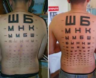 Этот парень из российской глубинки превратил при помощи татуировки собственную спину в таблицу для проверки остроты зрения. Не исключено, что такая тату пригодилась бы для офтальмологов, которые работают в сельской местности.