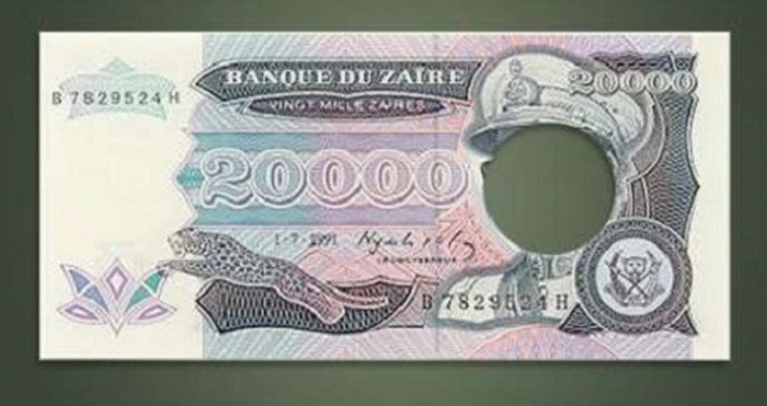 Когда Мобуту самого свергли в 1997 году, он бежал в один из своих домов в Марокко, где он умер спустя несколько месяцев от рака простаты. Страна, которая была вновь названа Конго, столкнулась с острой нехваткой банкнот. Поэтому было принято решение вернуть старые банкноты Заира номиналом 20 000 заиров, но с вырезанным из них лицом диктатора Мобуту.