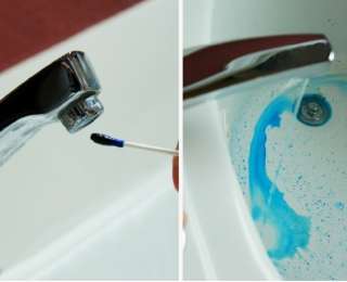 Нужно либо подкрасить рассекатель крана жидким красителем, либо пойти трудным, но эффективным путем: открутить рассекатель крана и положить туда таблетку пищевого красителя. Эффект будет более длительным. Для устрашающего эффекта можно выбрать краситель красного цвета.