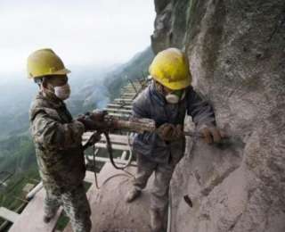 Для того, чтобы гулять по горным аллеям, на которых захватывает дух, и бросать с горы мусор, сначала эти самые мостики нужно кому-то проложить. В Хунане на 400-метровом склоне трудится команда и 21 мужика с титановым хозяйством, которая изо дня в день строит горных проход, висящий практически в воздухе.