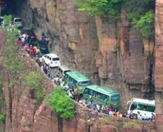 Снимки самой опасной пробки, которую только можно себе представить, были сделаны в Китае, на горе Гуо Лян Сун. Эту дорогу называют «13 героев», в честь 13-ти мужчин, которые за пять лет проложили её в горе. Протяжённость дороги – 1250 километров, ширина – 16 метров, в ней имеется 35 «окон».