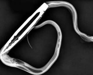 Владелец ручного питона из Австралии (кто бы сомневался) отправился кормить своего питомца крысой, держа ее в щипцах для барбекю. Но змея, судя по всему, была слишком голодна и проглотила обед вместе с импровизированным столовым приборам.