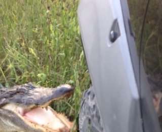 Мужчина обнаруживает в траве аллигатора и пытается спугнуть его при помощи своего внедорожника. Однако животное оказывается не робкого десятки и вскоре с лёгкостью отрывает бампер автомобиля.