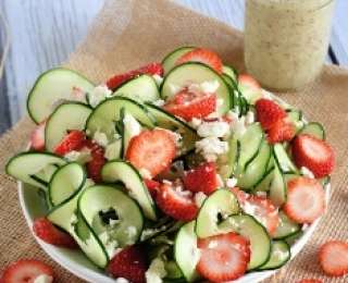 В большой миске смешайте 2 больших огурца, нарезанных в форме спирали, и 4 чашки клубники, нарезанной колечками. Посыпьте смесь рассыпчатым сыром фета и маком и подавайте на стол.