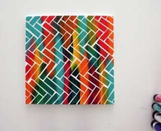 - Теперь вас ждет самая сложная часть, но ради грандиозного результата можно и постараться, ведь так? Отрежьте от малярного скотча равные кусочки. Разложите их на холсте по диагонали в шахматном порядке, оставляя между каждой полосочкой небольшое расстояние.