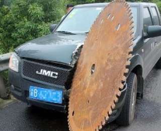 Произошло это на шоссе в Китае недалеко от города Чунцин. Водитель пикапа признался, что сразу и не заметил, что в его автомобиль что-то летит. Просто мощный удар и всё. Как оказалось позже, огромный диск от дисковой пилы сорвался с проезжавшего по встречной полосе грузовика и вылетел точно в этот самый пикап.