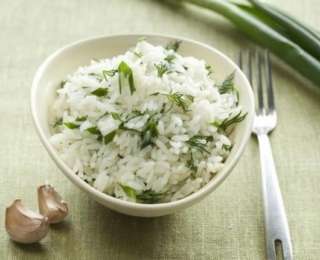Рис отварить до полуготовности. Чеснок нарезать и обжарить. Добавить к нему рис и обжарить все вместе. Затем добавить яйца, перемешать. Добавить зеленый лук, жарить еще 2 минуты, влить немного воды и накрыть крышкой. Готовить еще 10 минут.
