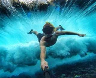 Оказавшись вдалеке от пляжа, Эрин не выпустила из рук селфи-палку, и камера запечатлела все ее попытки удержаться на поверхности.