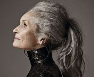 Бабушка четырех внуков, она совсем не стесняется своих лет и не делает попыток молодиться. К примеру, она не красит волосы. Роскошная серебряная копна волос — отличительная черта модели.