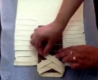 Возьми половину листа готового слоеного теста, положи на него шоколад. Вырежи из теста небольшие полоски, которые ты потом сможешь красиво сложить. Смотри на фото.