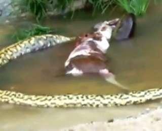 Охотники в бразильских джунглях сняли уникальные кадры того, как гигантская анаконда за полторы минуты исторгает из своего чрева крупное животное, похожее на корову.