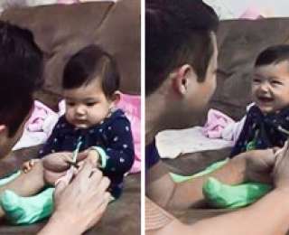 Молодая мама доверила отцу непростой процесс обрезания ногтей годовалой дочери, и совершенно зря. Такое серьезное занятие оказалось мужику не под силу, потому как каждый раз, когда он подносил ножницы к пальцам девочки, она тут же начинала ойкать, а потом хохотать.