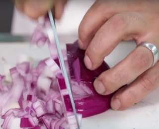 Луковица разрезается вдоль. Сначала нужно взять одну половинку и разрезать ее «горизонтально» на три части, прорезая овощ только на три четверти. Затем сделать такие же прорезы на три четверти «вертикально». Теперь можно нарезать.