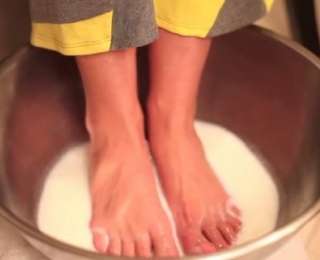 - В большую миску налей несколько стаканов теплого молока. Опусти ноги в миску так, чтобы жидкость полностью покрыла их. Если молока не хватило, можно добавить немного теплой воды. Молочная кислота действует очень благоприятно на кожу, смягчая и увлажняя ее. Подержи ноги в молоке некоторое время, чтобы кожа стала нежной.