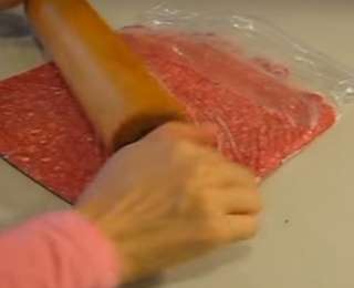 Для того, чтобы тебе не надо было постоянно замораживать и размораживать мясо,«Так Просто!» подготовил гениальный лайфхак! Мы предлагаем тебе заморозить фарш порционно, используя для этого обычный пакет и скалку.