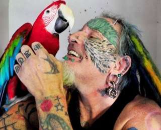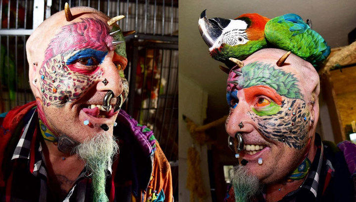 56-летний Тед Ричардс из британского города Бристоль посвятил свою жизнь тому, чтобы стать похожим на попугая. Бывший работник местной обувной фабрики, который держит дома пять попугаев, игуану и собаку, покрыл все свое тело татуировками и сделал вызывающий пирсинг. Он также хочет сделать свой нос похожим на клюв.