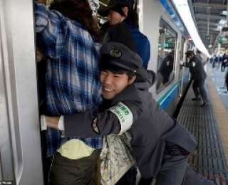 В токийском метро официально работают трамбовщики, которые помогают пассажирам протиснуться в переполненные вагоны в час пик.