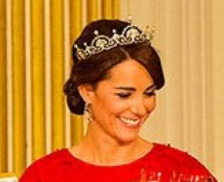 Для герцогини Кембриджской это был первый государственный ужин подобного масштаба. Для выхода в свет она выбрала алое платье Jenny Packham с атласным поясом. Голову Кейт украсила бриллиантовая папирус-тиара, принадлежащая королевскому хранилищу. Любимое украшение королевы-матери Кейт однажды уже примеряла (в 2011 году, на ежегодном дипломатическом приеме Елизаветы II), и, надо сказать, оно ей очень идет.