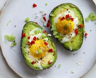 Приготовление: Разогрейте духовку до 180 градусов. Разрежьте авокадо пополам. Вытащите кость. Немного разомните мякоть авокадо, сделав углубления посередине. Положите половинки авокадо на противень. Разбейте в каждую часть по яйцу. Посолите и поперчите по вкусу. Поместите в духовку минут на 5 или до готовности яиц. Достаньте блюдо. Поместите на тарелку. Сверху посыпьте измельченным красным перцем, черным перцем и порезанным целеным луком.