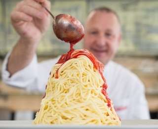 Заполни консервную банку ванильным мороженым. Возьми граненый стакан или баночку, которая без проблем будет входит и выходить из консервной банки. Вставь маленькую банку в большую жестяную, чтобы пропустить мороженое через отверстия. Предварительно подготовь охлажденную тарелку для будущего десерта.