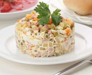 - Берем картофель, яйца и морковь, отвариваем, очищаем и нарезаем кубиками. Соленые огурцы также нарезаем кубиками.