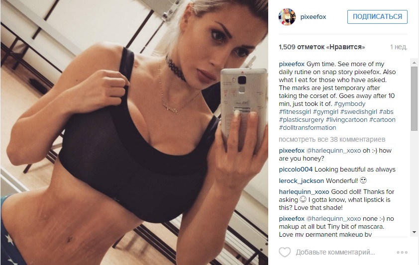 Пикси Фокс (25) всегда мечтала быть похожей на Джессику Рэббит – мультипликационного персонажа из детективных романов о кролике Роджере. Девушка упорно двигалась к своей цели. Она увеличила грудь, подтянула ягодицы, переделала лицо и удалила шесть ребер. Операция стоимостью £80 000 сделала Пикси обладательницей самой тонкой талии в мире – 36 см в обхвате.