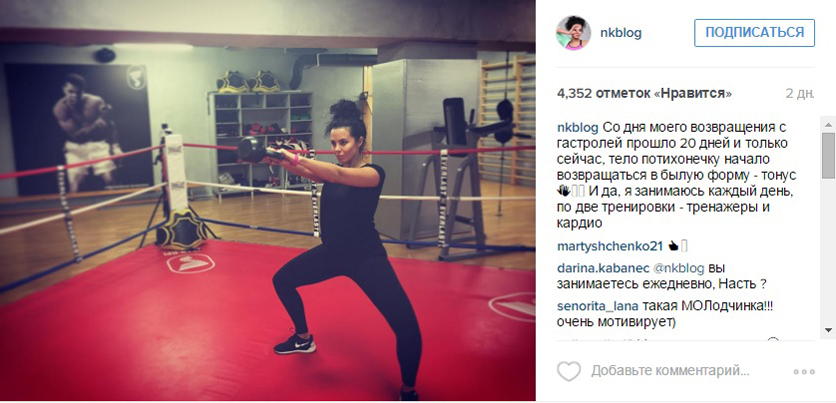Конечно, под каждой фотографией Настя не забывает оставлять и мотивирующие подписи. Например, под одним из снимков певица многозначительно написала, что занимается два раза в день: