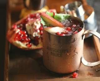 Смешайте гранатовые зерна, мяту и сок лайма в медной кружке, аккуратно перемешайте. Наполните кружку льдом, добавьте водку и сверху немного имбирного пива. Украсьте мятой и грушей.