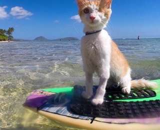 Этого кота зовут Кули, и ему очень повезло в жизни. Его хозяйки Александра Гомес иКриста Литтлтон из Гонолулу подобрали его на улице, когда он умирал от истощения. Девушки выходили котенка и приобщили к своему увлечению серфингом. Удивительно, но гавайский кот совершенно не боится воды и смело рассекает волны вместе с красотками!