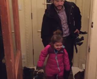 Мамы в большинстве своем куда более заботливы, чем отцы. Зато мужики изобретательнее. Этот папашка нашел простой способ разувать свою дочь после прогулки, используя при этом лишь одну руку. Быстро, легко, и руки пачкать не нужно.
