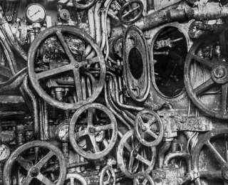 Центральный пост. На снимке видны глубиномер, корабельный телеграф, вентили для погружения и всплытия, а также горизонтальный руль подводной лодки.
