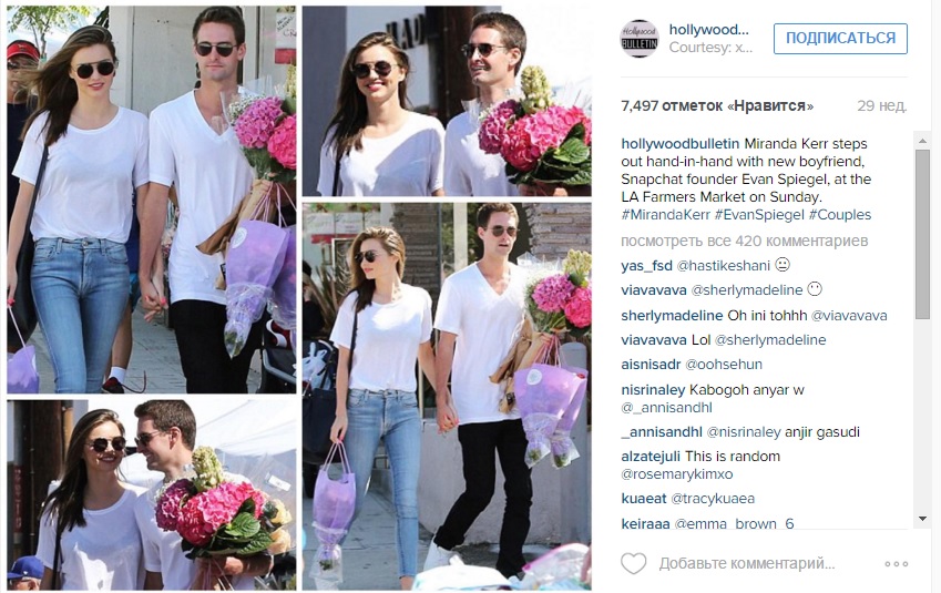 Сейчас «Ангел» Victoria’s Secret встречается с одним из основателей проекта Snapchat Эваном Шпигелем (25). Похоже, разница в 7 лет совершенно не мешает паре наслаждаться друг другом. Недавно Миранда была замечена в машине, разъезжая по Венеции, а на безымянном пальце у модели красовалось кольцо, очень похожее на обручальное. Возможно, Эван сделал своей возлюбленной предложение?