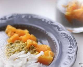 Срежьте ножом апельсиновую кожуру и порежьте его на кусочки. Маракуйю разрезать пополам и достать мякоть чайной ложкой. Добавить фрукты к пудингу и украсить кокосовой стружкой.